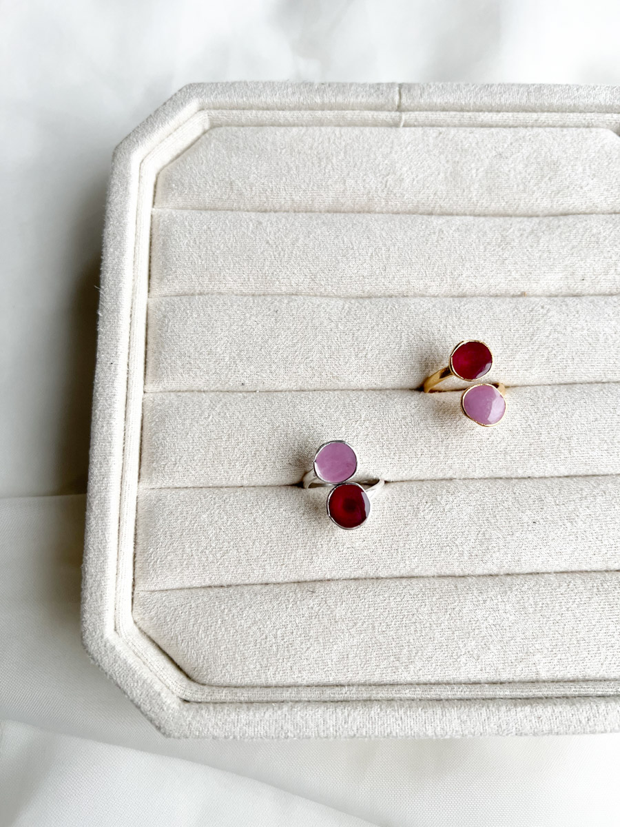Deze handgemaakte Berry pink ring combineert warme rood- en paarstinten in een verfijnd design. De verstelbare ring is van DQ material. afgewerkt met glanzende epoxy, waardoor iedere ring uniek is. Een stijlvolle eyecatcher voor elke gelegenheid.