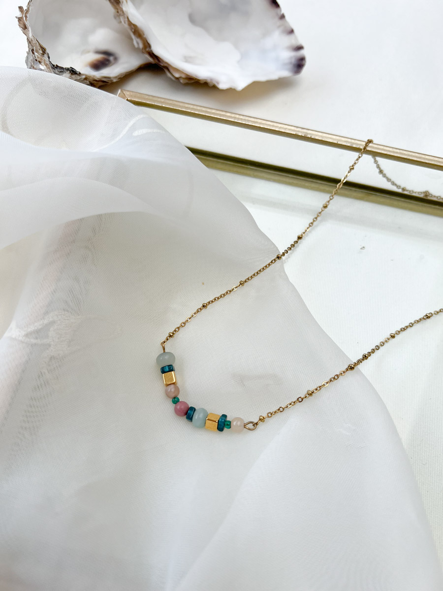 Vrolijke ketting met een combinatie van natuustenen en kralen met een speelse mix van pastel- en goudaccenten. Ideaal voor een zomerse, boho-look.