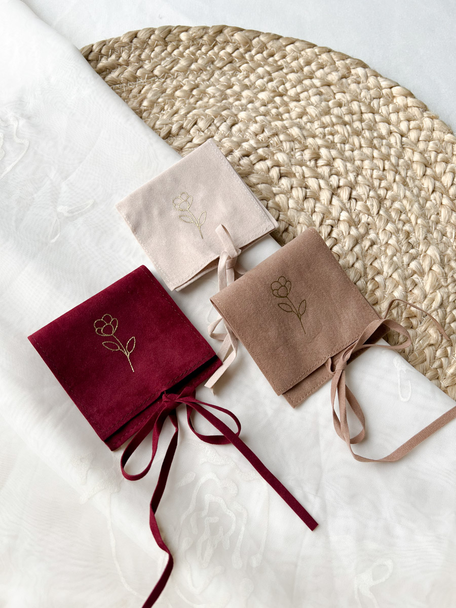 Voor een romantische en luxe verpakking kies je deze sieradenzakjes met striksluiting. De zakjes zijn gemaakt van zacht suède en afgewerkt met een sierlijke geborduurde bloem. Verkrijgbaar in elegante kleuren zoals beige, bruin en bordeauxrood, waardoor ze perfect zijn voor speciale gelegenheden zoals verjaardagen, jubilea of bruiloften.