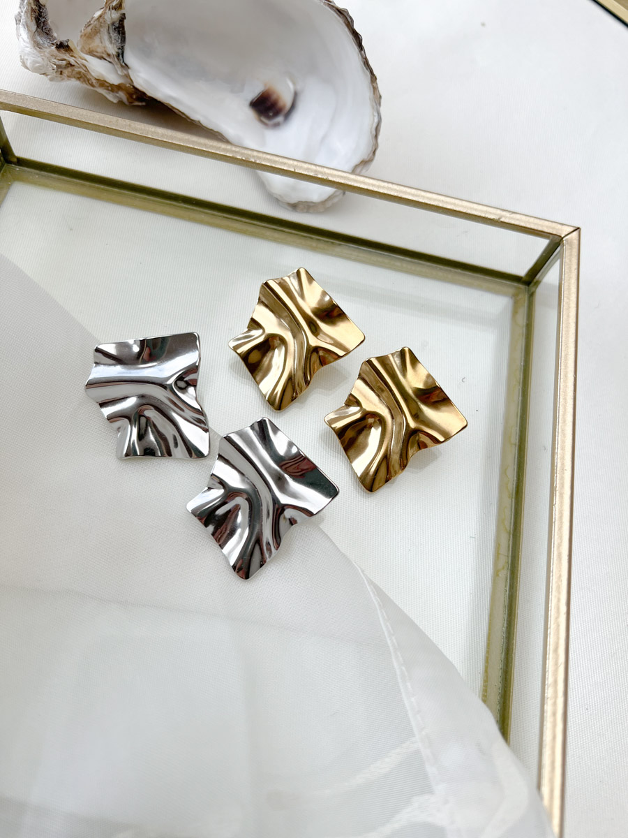 Deze unieke oorbellen hebben een vloeiend, spiegelend oppervlak en zijn perfect voor elke gelegenheid. Het past namelijk overal bij! De vierkante vorm met zachte plooien geeft een moderne, sculpturale uitstraling. Verkrijgbaar in goud en zilver.