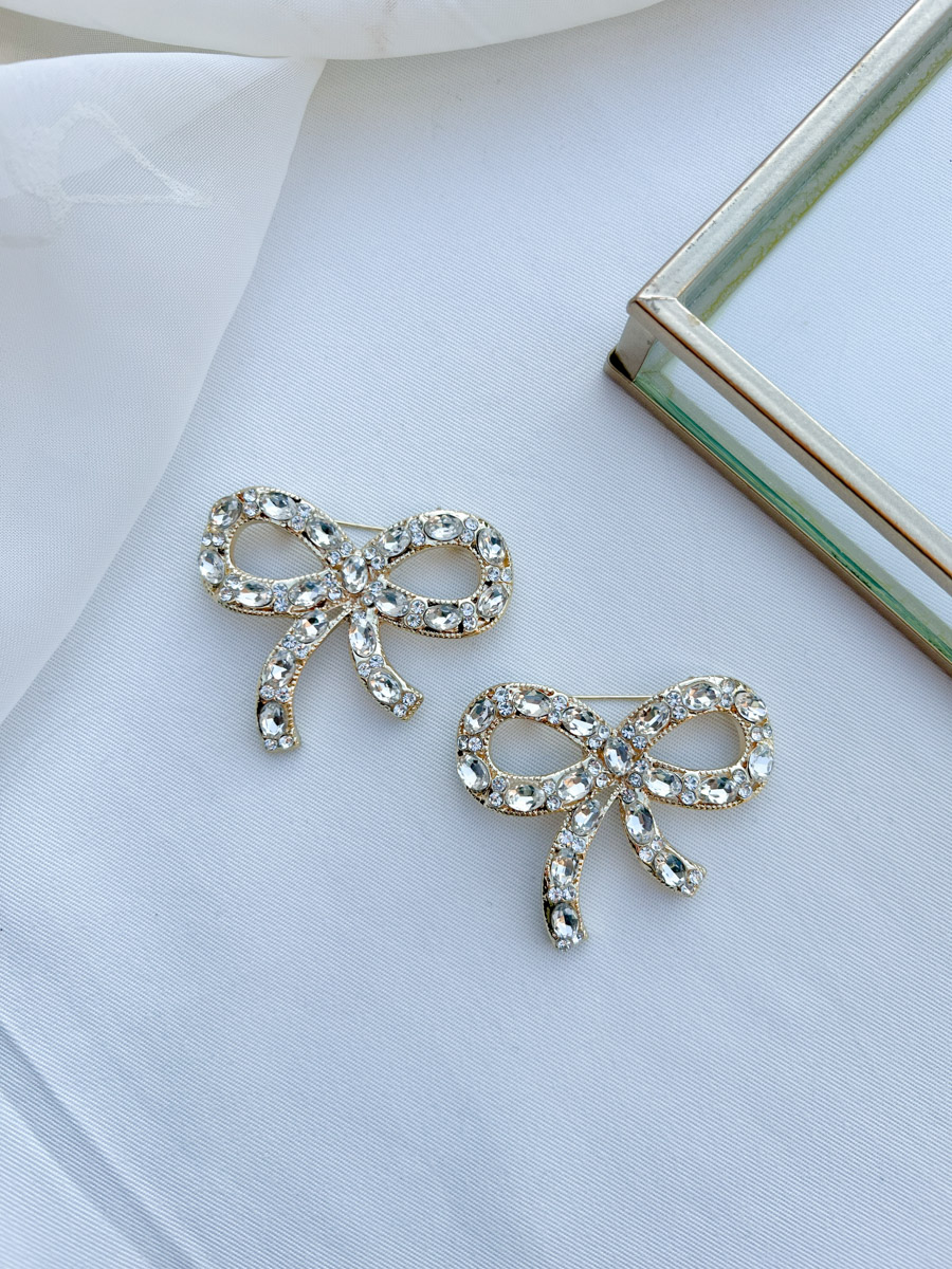 Deze strik broches zijn het toonbeeld van klassieke glamour, met hun sprankelende kristallen op een gouden basis. Ze geven een vrouwelijke touch aan je outfit en passen zowel bij feestelijke als alledaagse stijlen. Een veelzijdige accessoire die nooit uit de mode raakt.
