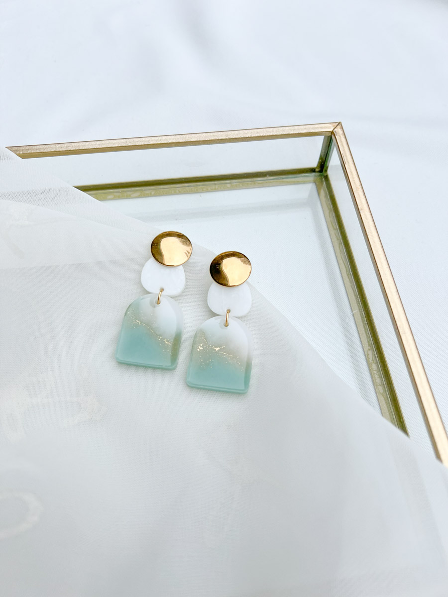 Elke oorbel is met de hand gegoten met resin (kunsthars), waarbij een prachtige ombre-overgang van wit naar mintgroen wordt gecreëerd. Fijne goudvlokjes in de hars geven een subtiele, luxueuze glans die opvalt zonder te overheersen. De oorbellen zijn afgewerkt met een ronde, goudkleurige RVS (roestvrijstalen) stud ook mogelijk in het zilver, wat niet alleen een chique uitstraling geeft, maar ook erg fijn draagt