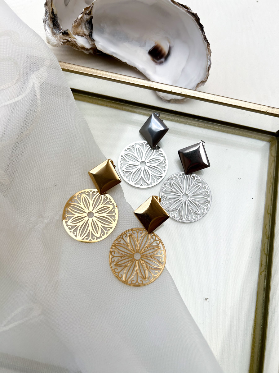 Deze geometrische oorbellen bestaan uit een uitgesneden ronde mandala hanger en een opvallende vierkante stud. De combinatie van goud of zilver met het gedetailleerde ontwerp maakt ze stijlvol én uniek.