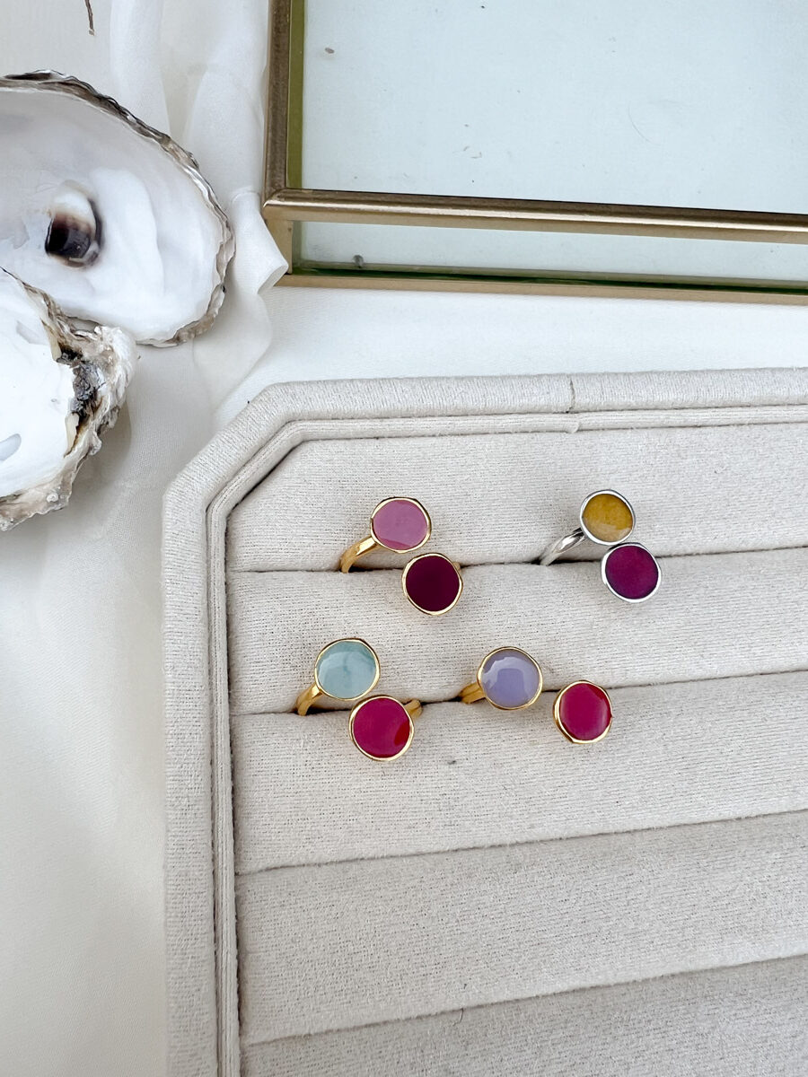 Breng kleur en vrolijkheid in je sieradencollectie met deze prachtige handgemaakte epoxy ringen. Elke ring is uniek door de combinatie van levendige kleuren zoals roze, rood, paars, blauw en geel. De ringen zijn verstelbaar en daardoor geschikt voor meerdere vingermaten. Ze worden met zorg met de hand gemaakt, wat zorgt voor een persoonlijke en ambachtelijke uitstraling. Of je nu één opvallend exemplaar draagt of meerdere ringen combineert, deze epoxy ringen geven elke outfit een speelse, chique en eigentijdse touch. Perfect als cadeau of om jezelf mee te verwennen.