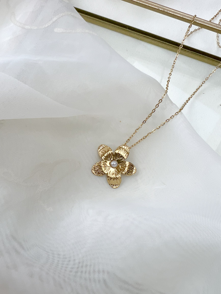 Elegante ketting met een gouden bloem en subtiele parel in het midden. Tijdloze charme voor elke gelegenheid.