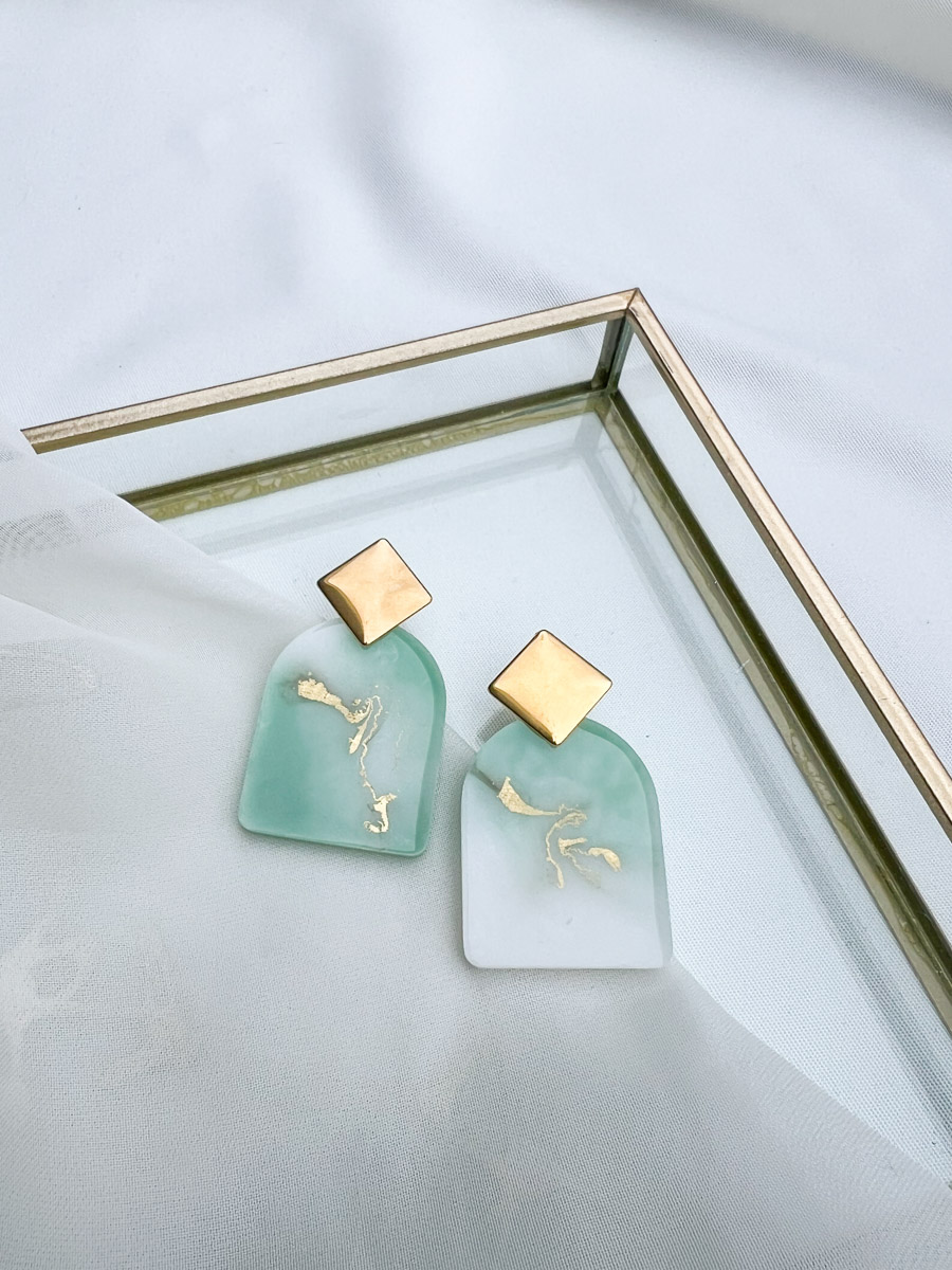 Deze Resin Art oorbellen zijn uniek . De combinatie van mintgroen en wit wordt verrijkt met elegante bladgoud-details, verwerkt in de resin. De vierkante gouden RVS studs zorgen voor een moderne en chique afwerking. Dankzij het handmatige proces is elk paar volledig uniek. Perfect voor een stijlvolle gelegenheid of als luxe cadeau.