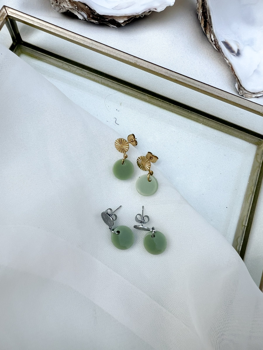 Stijlvolle handgemaakte oorbellen met een groene resin hanger en een subtiele gouden of zilvere zonvormige knop van RVS. Elegant en lichtgewicht – perfect voor dagelijks gebruik of een chique avondlook. Alle oorbellen zijn uniek doordat ze met de hand gemaakt worden. Daardoor is het ook mogelijk om iets samen te stellen naar je eigen wensen zodat het echt bij jou past!