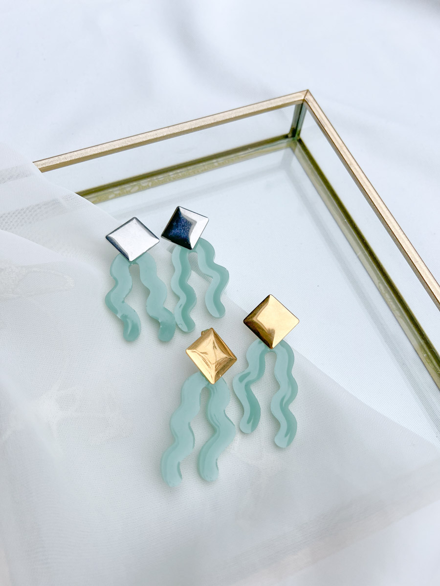 Met hun golvende mintgroene resin hangers en stoere vierkante studs (zilver of goudkleur), zijn deze oorbellen een uniek handgemaakt ontwerp dat speelse vormen en Resin Art perfect samenbrengt.