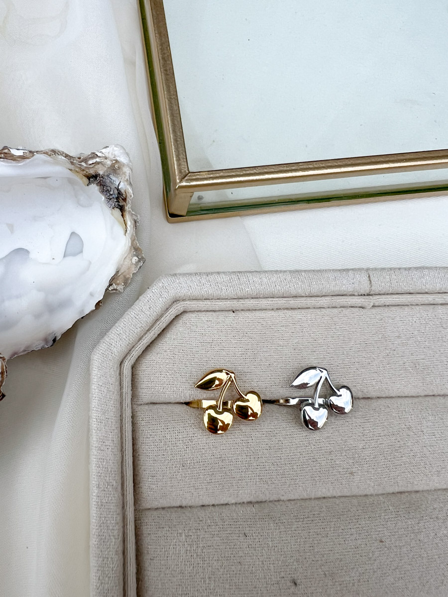 De happy cherry ring is een trendy verstelbare kersenring van roestvrijstaal in goud of zilver, een speelse toevoeging aan elke look.