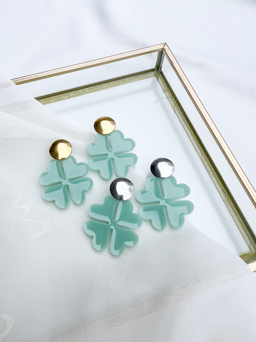 Speels en stijlvol: deze unieke oorbellen in klavervorm zijn met de hand gegoten uit mintgroene resin. De combinatie met een glanzende RVS stud (goud of zilver) maakt dit handgemaakte ontwerp een subtiel statement. En hopelijk brengt het wat geluk!