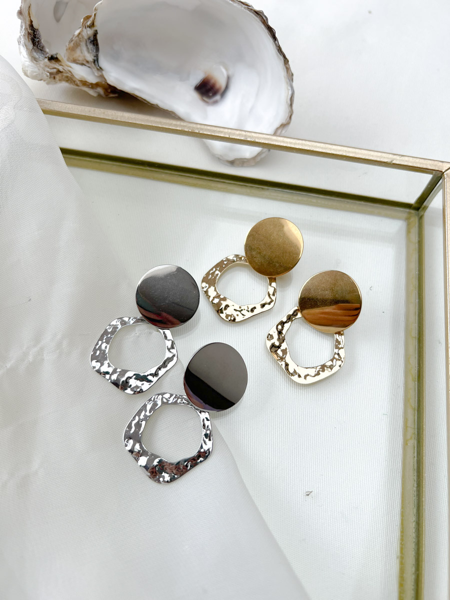 Deze stijlvolle oorbellen combineren ronde studs met organisch gevormde, gehamerde open cirkels. Het contrast tussen glad en textuur maakt ze uniek, licht en perfect voor zowel dagelijks gebruik als speciale gelegenheden.