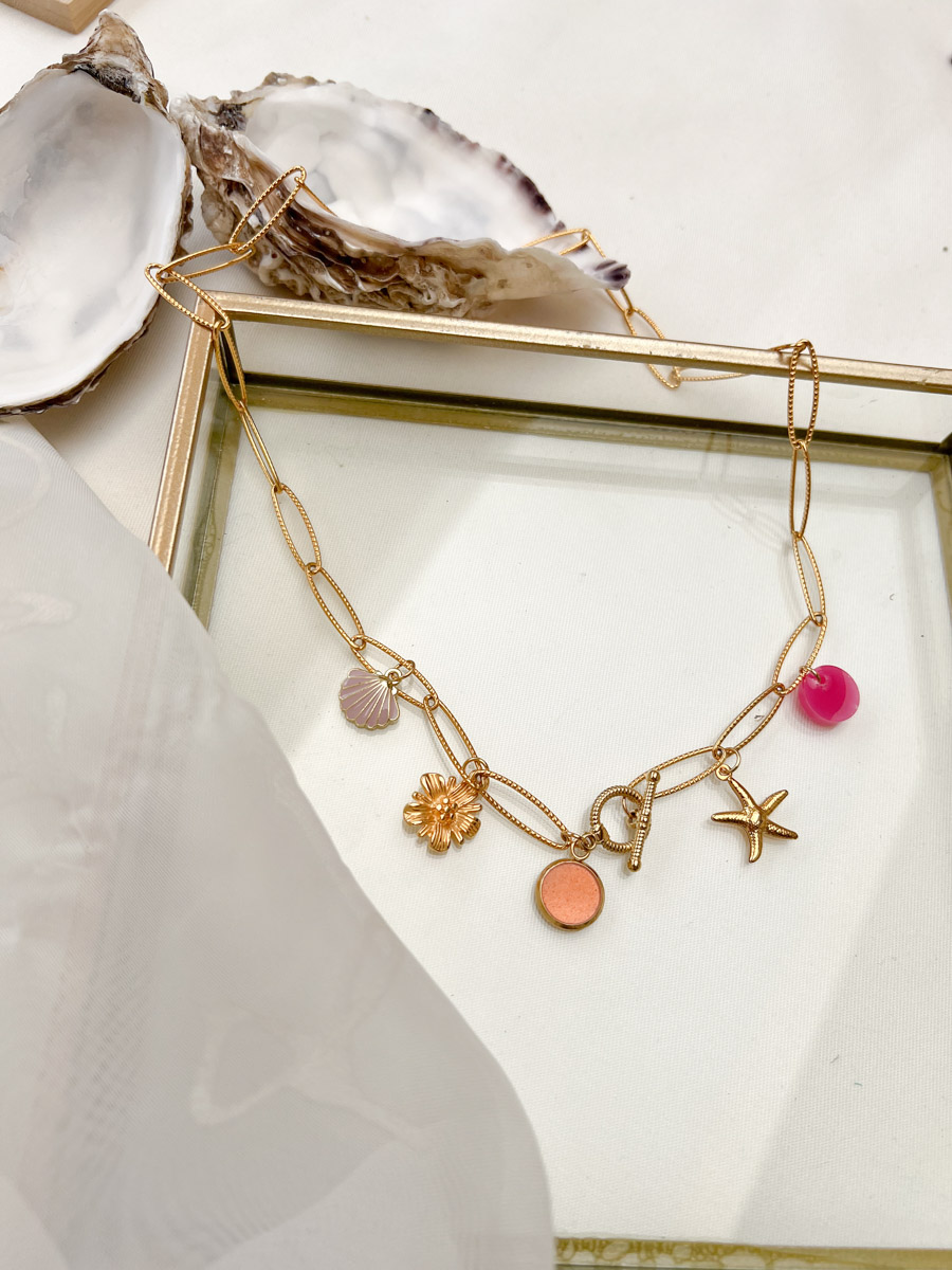 Deze stijlvolle bedelketting is geïnspireerd op zomerse elementen zoals schelpen, sterren en kleurrijke accenten. De gouden schakels en vrolijke hangertjes maken dit sieraad de perfecte toevoeging aan jouw zomeroutfit – ideaal voor strand, festivals of vakanties.