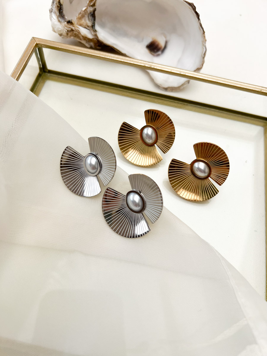 Laat je stijl stralen met deze elegante waaier oorbellen. De parel in het midden voegt een klassieke touch toe, terwijl het moderne RVS design zorgt voor een eigentijdse uitstraling. Verkrijgbaar in zilver en goud.