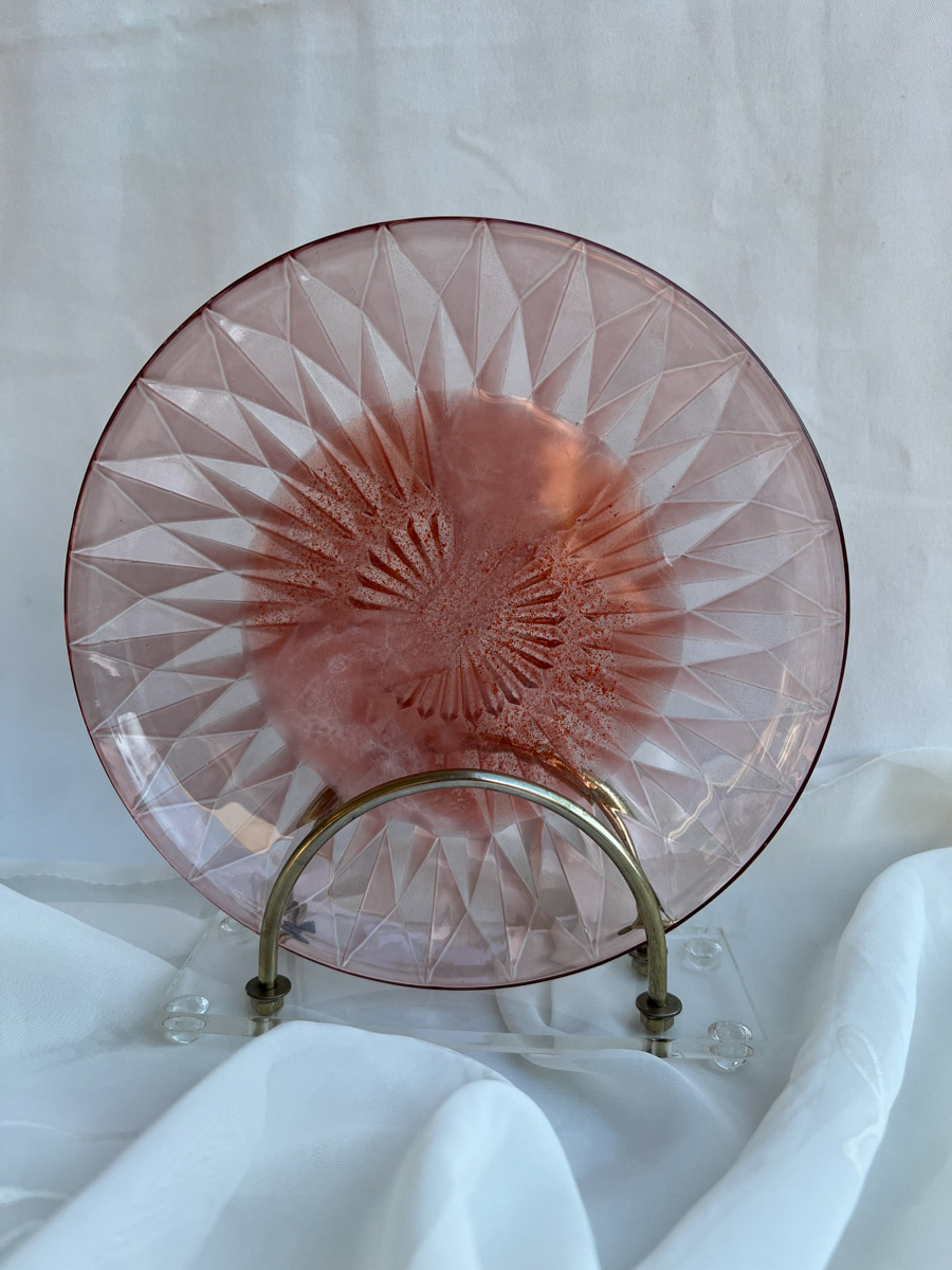 Een sierlijk roze plateau met glinsterende kristalvorm en zachte witte swirl.