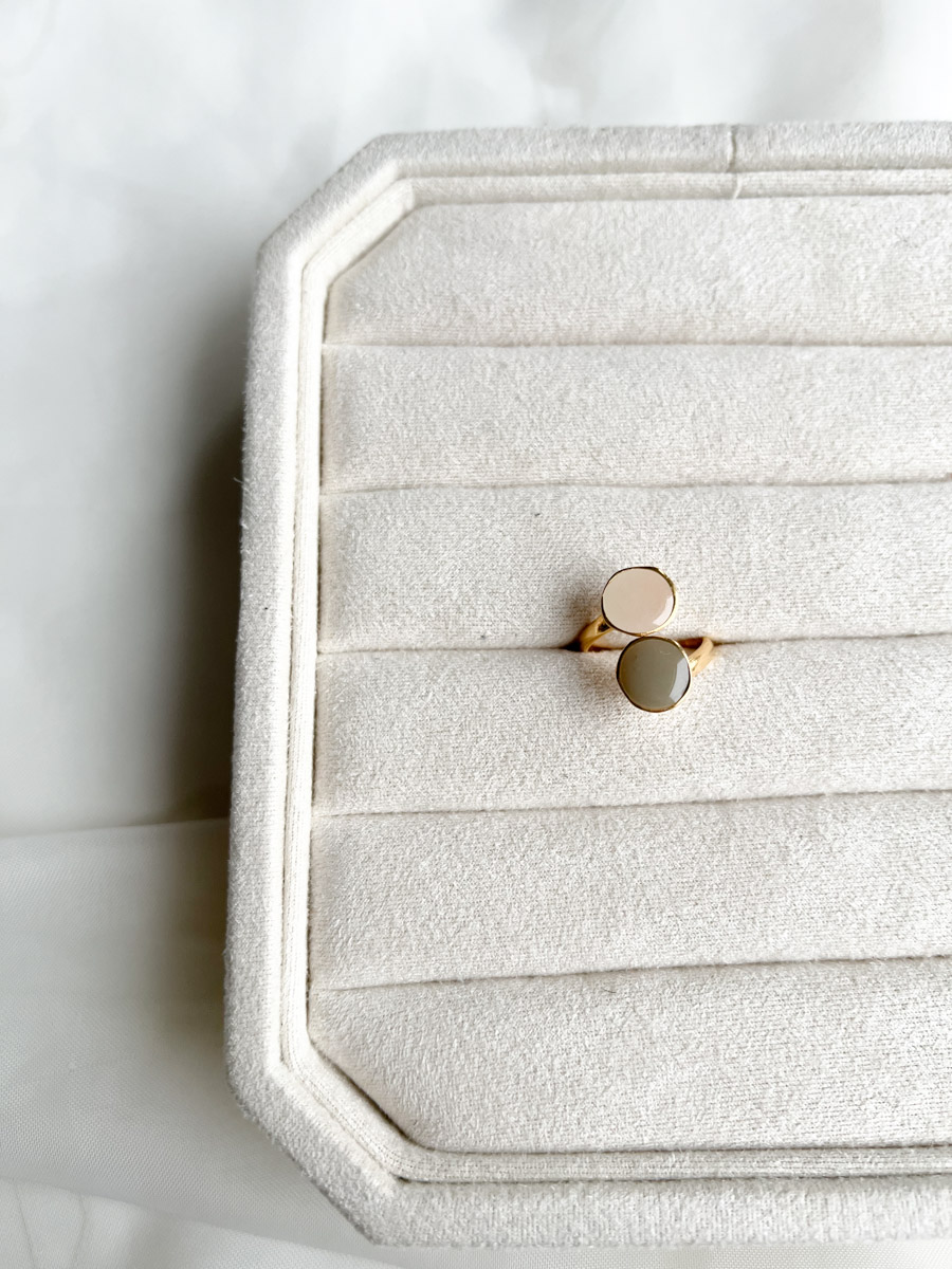 Ga voor subtiele schoonheid met deze handgemaakte epoxy ring in neutrale beige- en grijstinten. De ronde epoxystenen geven de ring een moderne en tijdloze uitstraling, waardoor hij moeiteloos combineerbaar is met elke outfit. Dankzij de verstelbare ringmaat draag je dit sieraad comfortabel. Het minimalistische design maakt de ring ideaal om te dragen als enkel statement of om te combineren met andere ringen voor een gelaagde look. Deze epoxy ring is een must-have voor wie houdt van stijlvolle eenvoud met een handgemaakt karakter.