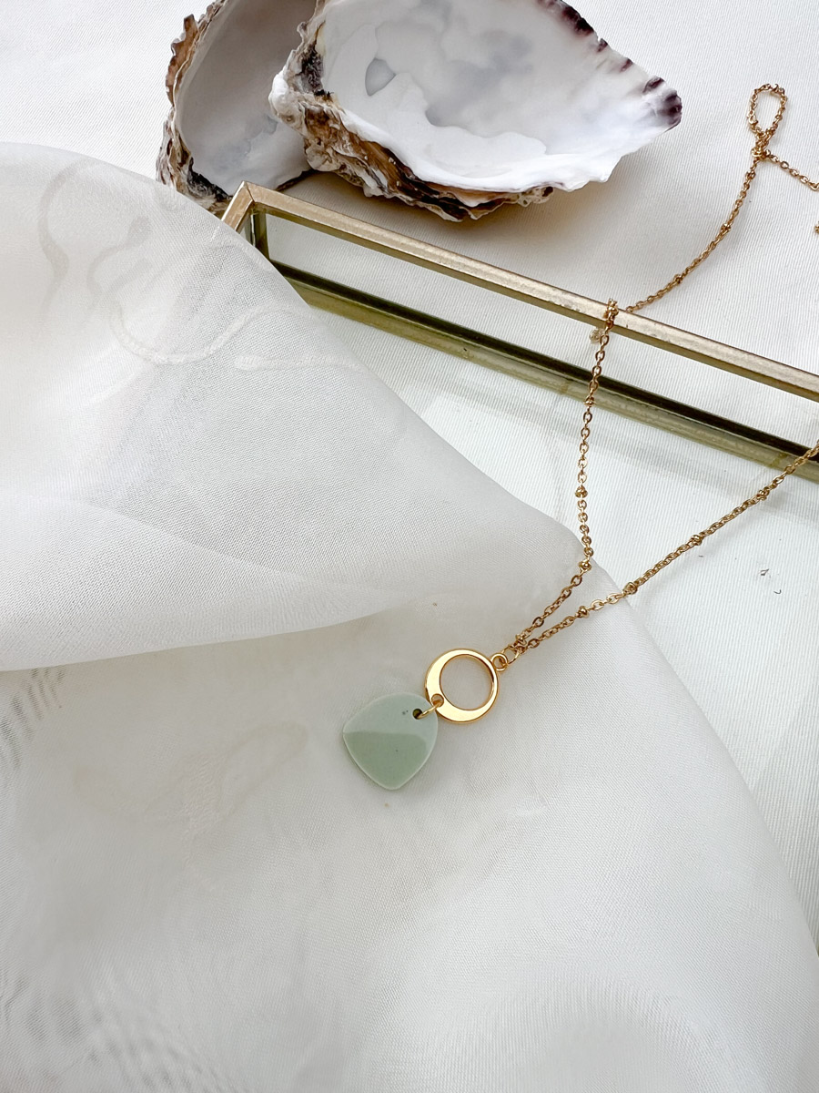 Minimalistische ketting met een zachtgroene hanger en stijlvolle gouden ring. Fris, subtiel en modern.