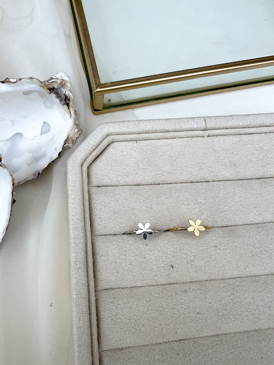Deze small flower ring is een minimalistische verstelbare bloemring van roestvrijstaal, verkrijgbaar in goud en zilver.