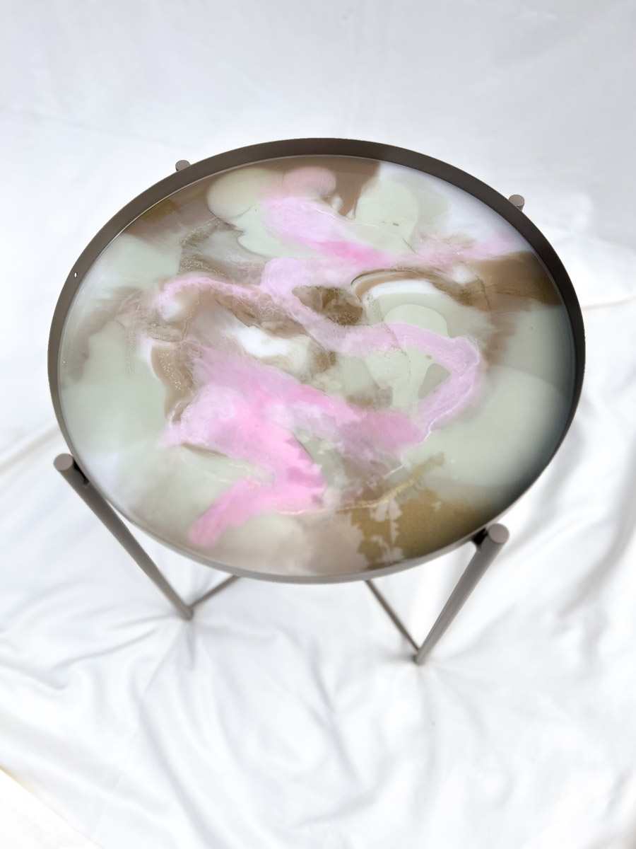 Met haar serene kleurenpalet van pastelroze, crème en warme bruintinten, brengt deze ronde epoxy bijzettafel rust en verfijning in elke ruimte. De subtiele kleurverlopen en transparante lagen creëren een bijna wolkenachtige uitstraling, perfect voor het tentoonstellen van je favoriete sieraden of als sfeervolle toevoeging aan je zithoek. Het slanke metalen frame maakt het geheel luchtig en modern – ideaal voor interieurliefhebbers die houden van elegantie en zachtheid.
