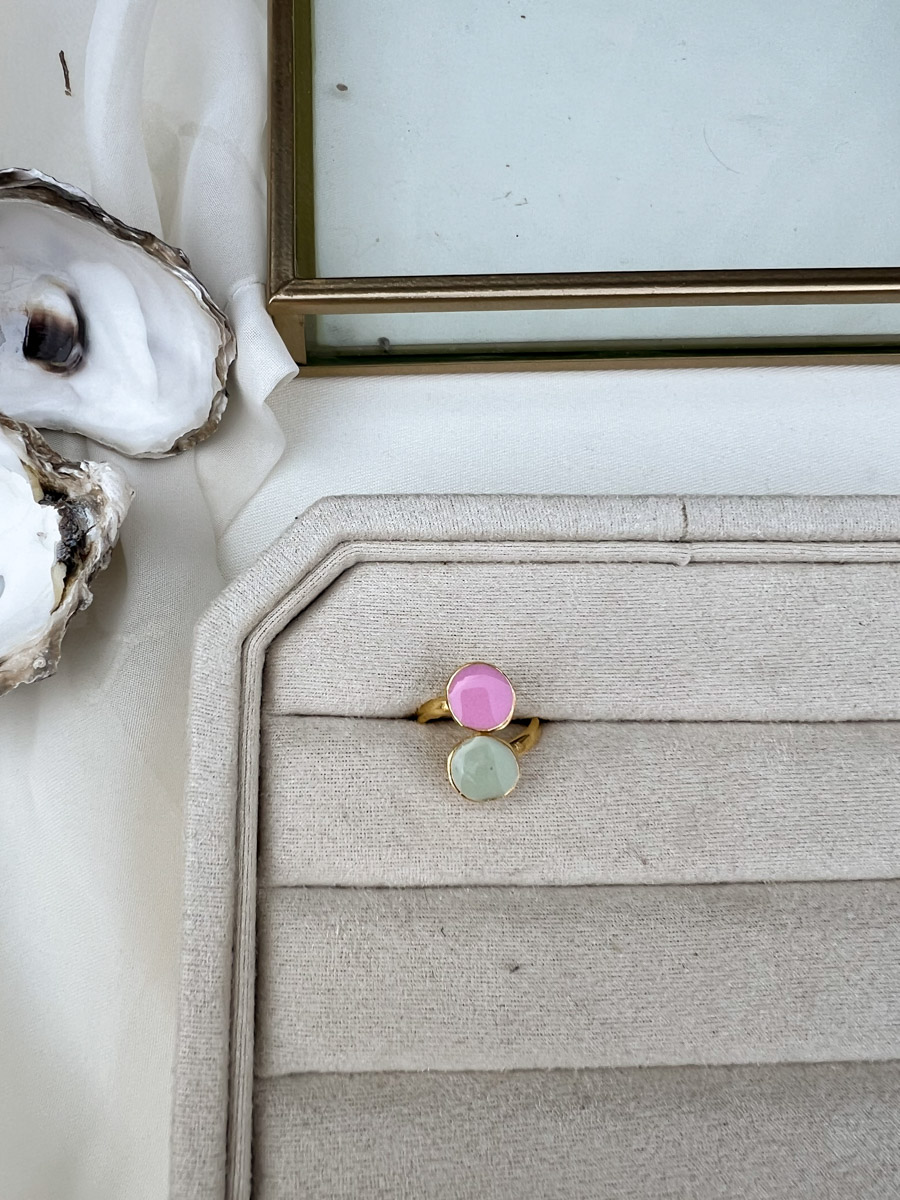 Deze handgemaakte epoxy ring springt direct in het oog dankzij de frisse en speelse combinatie van groen en roze. De ronde vormen en glanzende afwerking zorgen voor een moderne uitstraling, terwijl de goudkleurige basis luxe toevoegt. Omdat de ring verstelbaar is, past hij bij meerdere vingermaten. Deze epoxy ring is ideaal om je dagelijkse outfit meer kleur te geven of om te dragen als statement piece bij een speciale gelegenheid. Een prachtig handgemaakt sieraad dat vrolijkheid en elegantie combineert.
