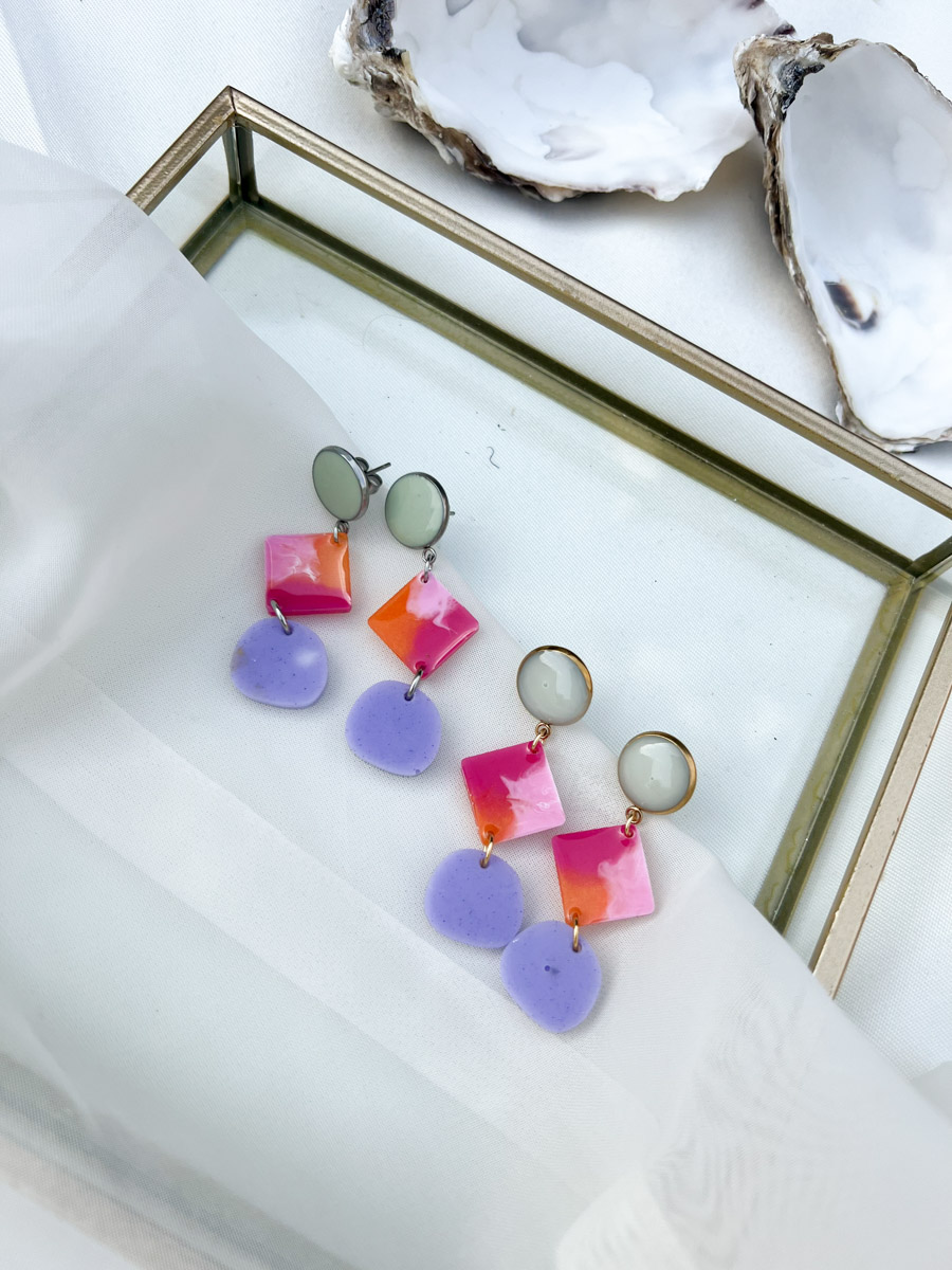 Met hun speelse combinatie van vormen en kleuren zijn deze resin oorbellen echte blikvangers. Vierkanten en ronde elementen in fuchsia, oranje en paars wisselen elkaar af, voor een dynamisch ontwerp. De oorbellen zijn met de hand gegoten uit hoogwaardige resin, wat elk paar volledig uniek maakt. Afgewerkt met ronde studs in een zachte kleur voor een harmonieuze balans.
