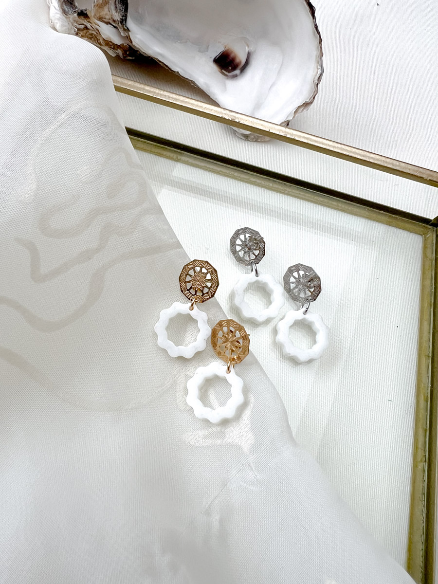 Deze opvallende oorbellen combineren een gesneden bloemachtig patroon in goud of zilver met een speels golvende witte resin ring. De perfecte balans tussen klassiek en modern maakt deze oorbellen ideaal voor zowel alledaags gebruik als feestelijke gelegenheden.