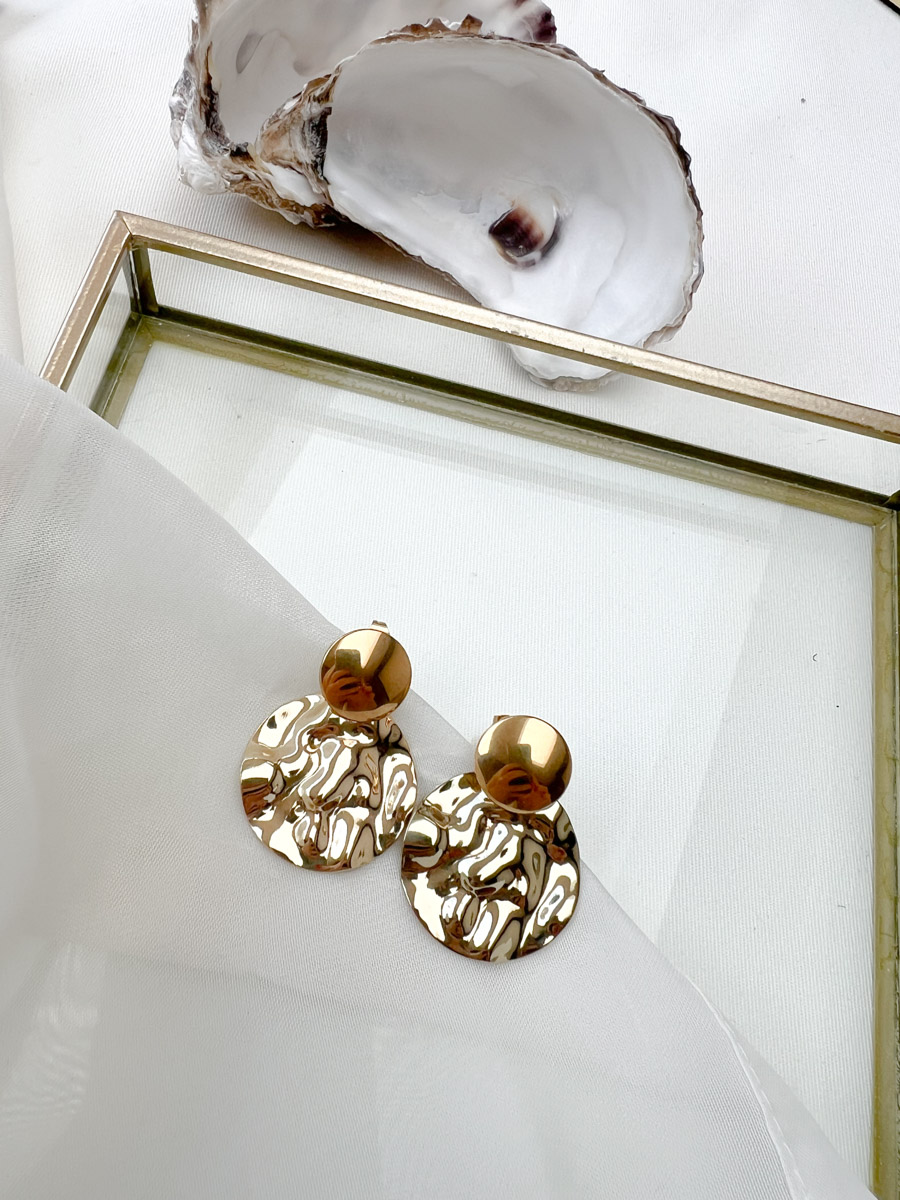 Deze ronde oorbellen hebben een speelse vorm, vloeibaar ogende structuur die bij elke outfit past. Het ontwerp in glanzend goud vangt licht op een unieke manier en geeft een luxe uitstraling. Ideaal voor feestelijke gelegenheden, diners of als opvallend detail bij een stijlvolle outfit. Deze oorbellen zijn gemaakt van RVS en combineren draagcomfort met elegantie.