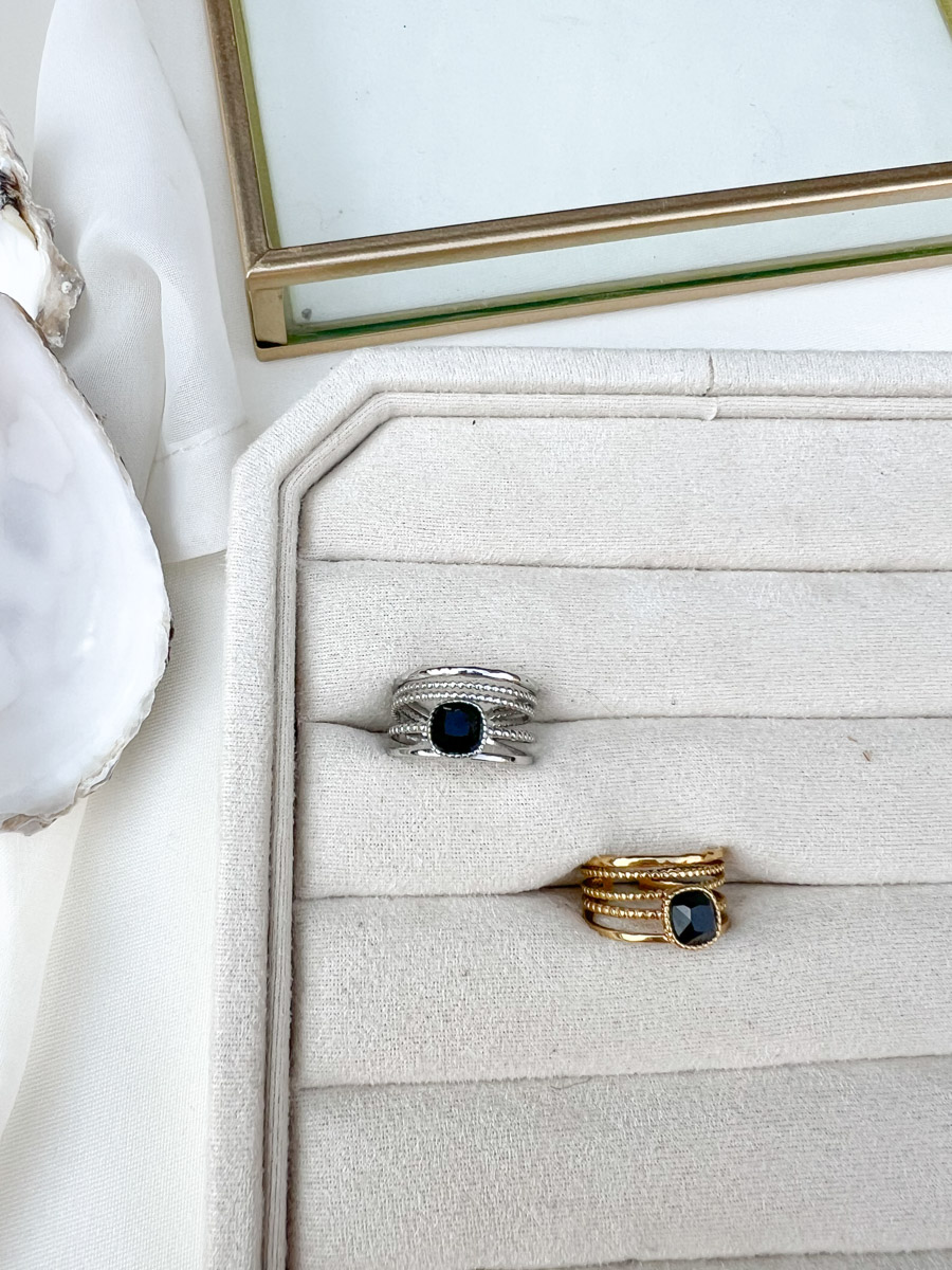 Deze stijlvolle ring combineert luxe en eenvoud. De zwarte steen staat centraal en wordt omlijst door een elegante band van roestvrij staal, verkrijgbaar in zowel goud als zilver. De verstelbare ring past altijd en is perfect om te dragen bij zowel dagelijkse outfits als chique gelegenheden. Dankzij het duurzame materiaal blijft de ring mooi, ook bij veelvuldig gebruik. Een veelzijdige toevoeging aan jouw sieradencollectie.